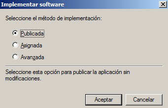 Importante: En este último paso dependiendo si la directiva se aplica a un usuario o equipo es cuando seleccionaremos el tipo de instalación: Asignar a equipos o Asignar/Publicar a usuarios.